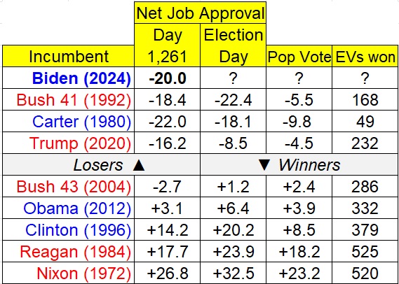 Using the data from 538, here is the updated chart comparing Biden against past presidents running for re-election, on day 1,261 of the first term: