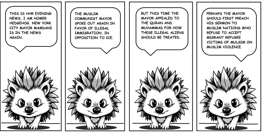 Today’s cartoon was an easy one. First thing I thought of when Mamdani started appealing to Muhammed and the Quran in his sermon to us. He should first preach it to all these nations in the middle east who won’t even accept and integrate the fragments of Muslim families left behind by Muslim vs. Muslim violence.